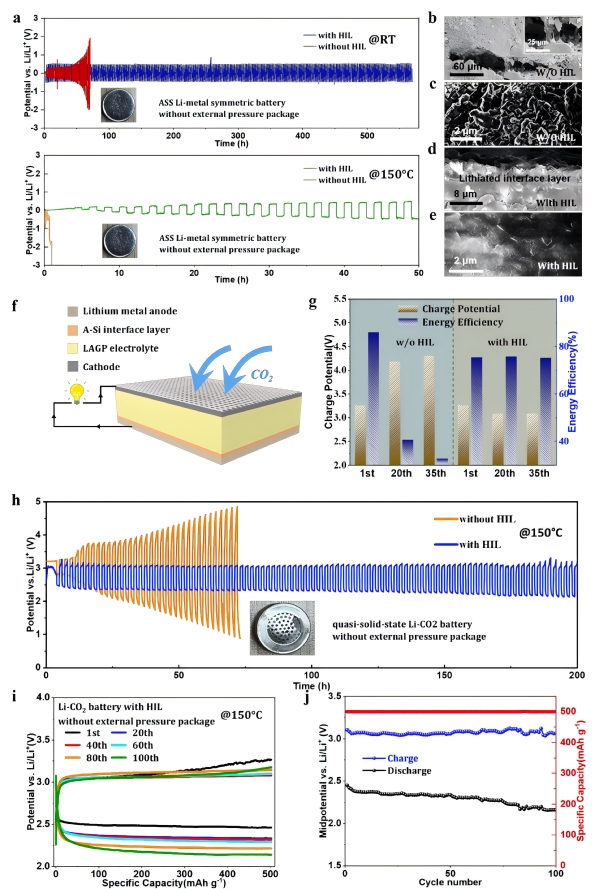 图4.锂金属电池的循环性能与表征。a)在RT以及超过150℃的HT下,电流密度为0.1 mA cm⁻²时,有/无HIL的锂对称电池的循环性能。b)在RT下循环后,无HIL的LAGP的横截面SEM图像。c)室温下循环后,无HIL的LAGP的平面SEM图像。d)在RT下循环后,有HIL的LAGP的横截面SEM图像。e)在RT下循环后,有HIL的LAGP的平面SEM图像。f)无外部压力封装且带有HIL的Li-CO₂电池的示意图。g)在150℃、电流密度为500 mA g⁻¹、容量限制为500 mAh g⁻¹的条件下,有/无HIL的固态Li-CO₂电池的能量效率。h)在150℃下运行时,有/无HIL的Li-CO₂电池的电压-时间曲线。i、j)带有HIL的Li-CO₂电池在150℃下的电化学循环性能。