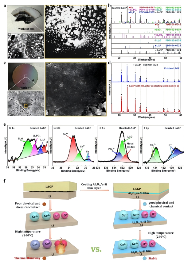 图3.热失控实验后有/无Al₂O₃和a-Si HIL的LAGP的表征。a)热失控实验后,无HIL的原始LAGP的数码照片和SEM图像。b)热失控实验后,无HIL的原始LAGP的XRD图谱。c)热失控实验后,有HIL的LAGP的数码照片和SEM图像。d)热失控实验后,有HIL的原始LAGP的XRD图谱。e)热失控后产物的XPS图谱。f)负极界面改性抑制热失控的原理示意图。