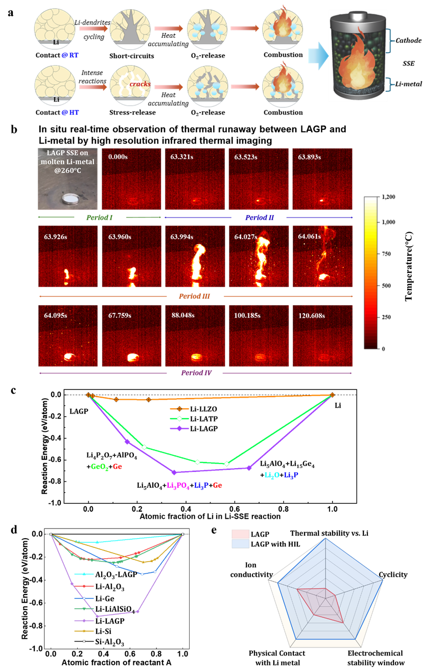 图1.含LAGP的固态锂电池的热失控情况。a)固态锂电池中热失控的两种路径的示意图。b)热失控的系列热红外图像(作为时间的函数)。c)Li-SSE界面之间计算得出的反应能。最大反应能对应于反应Li+Li1.5Al0.5Ge1.5(PO4)3→Li5AlO4+Li3PO4+Li3P+Ge。d)各种A-B界面之间计算得出的反应能。e)改性前后的性能对比。