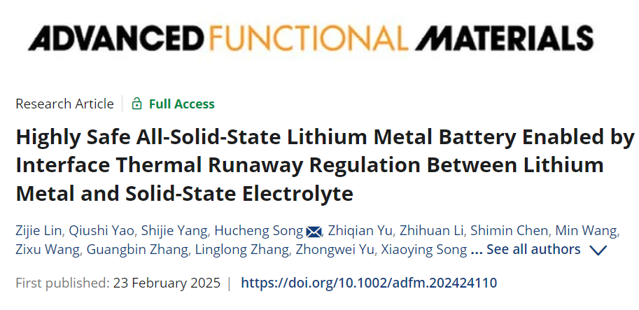 为了解决上述问题,物理学院研究员宋虎成联合南京大学/南通大学徐骏教授团队合作在《Advanced Functional Materials》期刊发表题为“Highly Safe All-Solid-State Lithium Metal Battery Enabled by Interface Thermal Runaway Regulation Between Lithium Metal and Solid-State Electrolyte”的研究论文,南京大学硕士研究生林子杰、南京航空航天大学副研究员姚秋石为论文共同第一作者,研究员宋虎成、教授徐骏为论文共同通讯作者。物理学院教师张广斌、张玲珑和研究生杨世杰、王孜旭参与了该项研究。