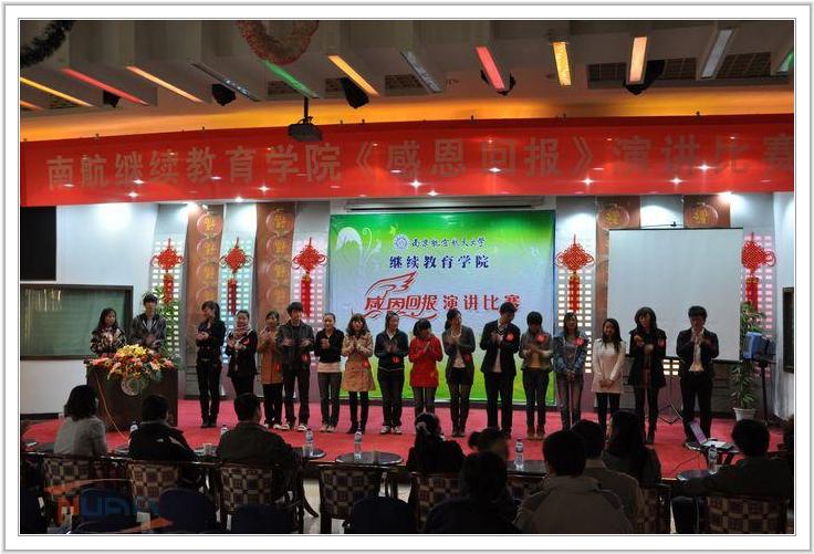 2010年10月30日,继续教育学院“感恩·回报”演讲比赛在西苑教工活动中心举行。经过两轮的初赛,最终脱颖而出15位选手在这里展开了激烈的角逐,为在场的师生们奉献了一场精彩的演讲,近200名学生现场学生共同聆听了他们激情飞扬的演讲。 本次大赛以“感恩·回报”为主题,分为“感恩家人”、 “感恩朋友”、“感恩祖国”、“感恩自然”等4个环节。15位参加决赛的选手都做了精心的准备。他们的演讲内容充实,紧扣主题,情真意切,深深地打动了每 一位听众。整个比赛过程精彩纷呈,既有慷慨激昂、激情四溢真情告白,又有动情的歌唱和优美的舞蹈。参赛选手用各自独特的方式将“感恩·回报”这个永恒主 题,演绎成了一道道美丽的风景线,令人回味。现场不时掌声雷动,许多观众不禁流下眼泪。