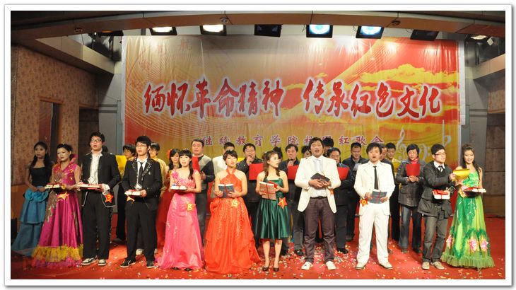 12月22日晚,继续教育学院在大学生活动中心举办了主题为“缅怀革命精神,传承红色文化”校园红歌会演唱比赛活动。各校区学生特别是党员和入党积极分子到场观看了比赛,学院党政领导和各部门负责人悉数到场,并担任了此次比赛的评委。 由学院舞蹈队带来的气势磅礴的集体舞《军之舞》拉开了整场红歌会的序幕。15位参赛选手分别演唱了《龙的传人》、《映山红》、《长江之歌》、《春天的故 事》等多首爱国歌曲。经过精心准备和排练,选手们以饱满的热情,唱出了心中对祖国、对人民、对党的诚挚的热爱。比赛中,所有参赛者都制作了彰显歌曲主题的 幻灯片,有的选手还富有创意的穿插了烘托气氛的伴舞,表现出了美的艺术。辅导员邹蓉和刘超两位老师演唱的歌曲《国家》,博得了现场观众的热烈掌声。比赛共 评出了10位“闪闪的红星”,颁奖结束后,全场师生齐唱《歌唱祖国》。 “这与印象中的唱歌比赛不一样。内容很特别,方式很新颖。”大三学生过亮宜说,“我从未想过那一首首红色歌曲背后还有那么多感人的故事。”大二学生杨露表示:“在这个流行音乐充斥 校园的时代,我们几乎没有用心去聆听那些来自历史的声音。没想到今天红歌会的气氛会如此热烈,一首歌,一句话,就可以让自己的情绪奔泻而出。” “随风潜入夜,润物细无声。”欣赏和研习红歌,是一项集艺术性、知识性和情感性于一体的体验,通过这种柔性的情感教育方式来诠释党的基础知识和基本理论,以情感抒发与历史讲解相结合,激励一代青年人发奋努力,非常适合现阶段青年人的思想特点。
