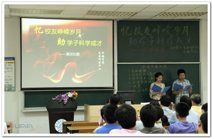 5月20日下午,为迎接建党90周年和南航建校60周年,发展研究中心以“杰出校友访谈”活动为载体,联合民航学院,在将军路校区5102教室共同举办“忆校友峥嵘岁月,助学子成长成才”演讲比赛。校发展研究中心主任孔垂谦、民航学院党委副书记刘建成等8位老师应邀担任此次比赛的评委和嘉宾。 刘建成老师在开幕词中指出,此次活动意义重大,希望同学们通过参加这次活动,能有所感、有所悟,进一步激发同学们向杰出校友和优秀党员学习的热情和动力,“树信心、立大志”,奋发学习、刻苦钻研,为学校和国家民航事业的发展打下坚实的基础。 本次演讲比赛经过民航学院筛选、推荐,共有10名优秀学生代表参赛。参赛选手在认真学习或聆听南航杰出校友优秀事迹和成长经历的基础上确定了演讲主题。演讲中,选手们从自己的实际生活和学习出发,慷慨激昂、声情并茂地表达了向杰出校友和优秀党员学习的热情、动力和决心。现场气氛热烈,选手们的精彩表现不时赢来台下阵阵掌声。 颁奖典礼之后,孔垂谦老师致闭幕词。他充分肯定了本次比赛的意义,赞扬参赛选手的精彩表现,并希望同学们都能以优秀校友为榜样,不断充实大学生活,争取将来成为社会栋梁之才,为我国民航事业的蓬勃发展做出卓越贡献。在随后的互动环节中,同学们表示杰出校友的成长历程、奋斗事迹和人生信条,是激励大家奋发向上、立志成才的精神财富,并表达了要在大学期间用知识充实自己、用实践锻炼自己、用经验提高自己,踏实地走好每一步的美好愿望和决心。
