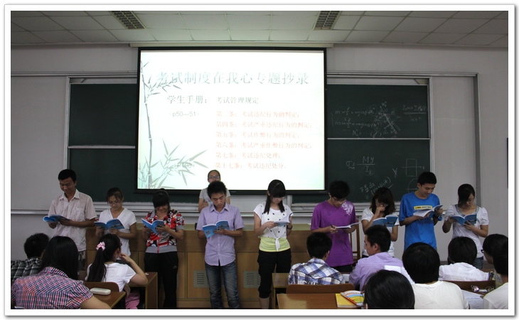 6月22日上午,材料科学与技术学2010级全体学生参加了“诚信考试在我心”的主题教育活动。 期末考试临近,学生已进入紧张备考状态,为避免触碰“高压线”——考试作弊或其他违纪现象的出现,2010级辅导员黄芳组织了此次主题教育活动。本次活动旨在使学生牢记考试制度规定及违纪处分办法等相关条例,做到诚信考试在我心。活动中,辅导员首先进行了“诚信考试,诚信做人”的相关教育,强调了考试的注意事项。全体学生朗读了学生手册《南京航空航天大学考试管理规定》,并抄写了学生手册《南京航空航天大学违纪处分办法》第十七条。本次活动响应了学校严肃考风考纪的号召,切实增强了学生对考试违纪甚至作弊严重性的了解,对有效预防违纪发生,引导学生诚信做人有重要作用。 大一学生仍保持着高中严谨的考试态度,但松懈现象也时有发生,“诚信考试在我心”主题教育活动为即将到来的期末考试营造了风清气正的氛围,也为迎接大二崭新的学习生活打下了良好基础。