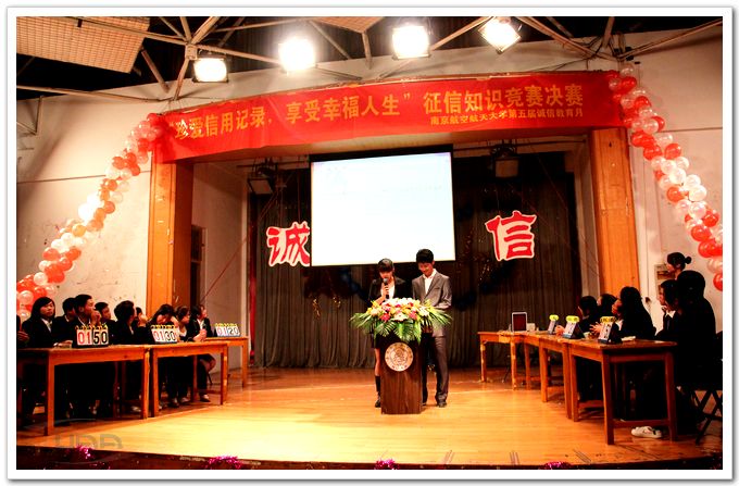 11月17日晚,第五届诚信感恩教育月之“超细玻璃棉”杯“珍爱信用记录,享受幸福人生”征信知识竞赛决赛,在我校将军路校区大学生活动中心举行。学生处资助管理中心主任刘红旗、电子信息工程学院团委书记张晓燕以及来自各个学院的辅导员等出席了活动。 本次征信知识竞赛分为初赛和决赛两场,经过初赛选拔,最终来自航空宇航学院、电子信息工程学院、材料科学与技术学院、民航/飞行学院、经济与管理学院、人文与社会科学学院、外国语学院等七支代表队进入决赛。 比赛伊始,七支代表队围绕诚信主题分别进行了队伍展示,“诚知聚”、“信灯”、“诚信之翼”等各具特色的队名以及丰富多彩的展示展现了各个代表队良好的精神风貌。正式比赛中各个代表队激烈角逐,必答题环节成绩不相上下,抢答环节和风险题环节中竞争则更为激烈。最终,材料科学学院代表队获得本次征信知识竞赛一等奖。 据悉,为加强对大学生的诚信感恩教育,增强学生对个人信用记录的重视程度,我校举办了第五届“超细玻璃棉杯”诚信感恩教育月活动之“珍爱信用记录,享受幸福人生”征信知识竞赛。该活动由学生处、研究生院主办,电子信息工程学院、经济与管理学院承办,活动得到了各个学院的大力支持。通过此次比赛,学生更好地了解了征信知识,在增强诚信意识的同时也表示会珍爱自己的信用记录。