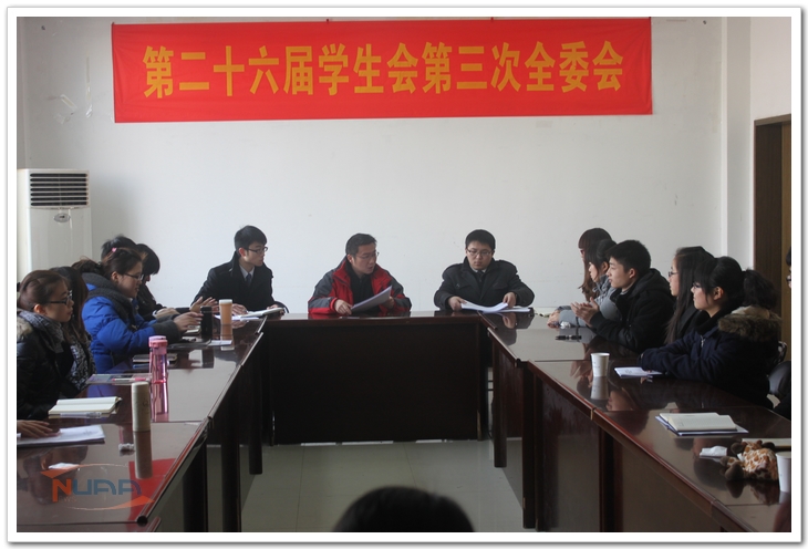 2012年2月25至26日,我校第二十六届学生会第二次全委扩大会、第三次全委会在将军路校区艺术中心多功能厅举行。 会议审议通过了《第二十六届学生会2011年度工作报告》《第二十六届学生会2012年度工作计划》等决议,经过民主投票选举鲍安其等11名同学为新一届学生会常委,选举周文柏等6名同学递补为新一届学生会委员。