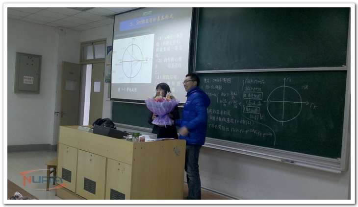 《微波技术与天线》课前的温馨小感动 与此同时,1510101班的同学们也在以他们的方式表达着对老师“三·八”妇女节的祝福。3月8日上午,同学们提前来到教室做好了准备,等待着仲伟志老师的到来。仲老师走进教室后,全班的同学集体起立,向这位爱岗敬业的老师致以崇高的敬意:“祝仲伟志老师节日快乐!” 随后班长王顺飞同学代表全班同学向老师赠送了鲜花。