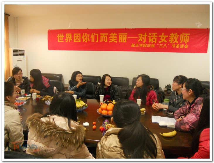 “女生节”意外的惊喜 对于南航大航天学院401班的女生来讲,3月7日是特别的一天。这一天,东区24栋的大楼上悬挂着“1510401班的女生们:不管明天你们是谁的女人,永远是我们的女生。‘3·7’女生节快乐!”的横幅。这是401班男生送给他们班四个女生的“女生节”礼物。侯雨彤同学看到后说:“很温馨很感动。我们班男生对我们真好,401班这个大集体,很有爱,生活在这样一个充满温馨感动的集体中我很开心。我要把它拍下来,作为纪念。” “世界因你们而美丽——对话女教师” 3月8日上午,为庆祝第102个“三·八”国际妇女节,航天学院召开“世界因你们而美丽——对话女教师”为主题的茶话会。学院女教师、女学生代表等20人参加会议,以茶话会的方式庆祝“三·八”妇女节,并为每位出席人员送一支康乃馨作为节日祝福。