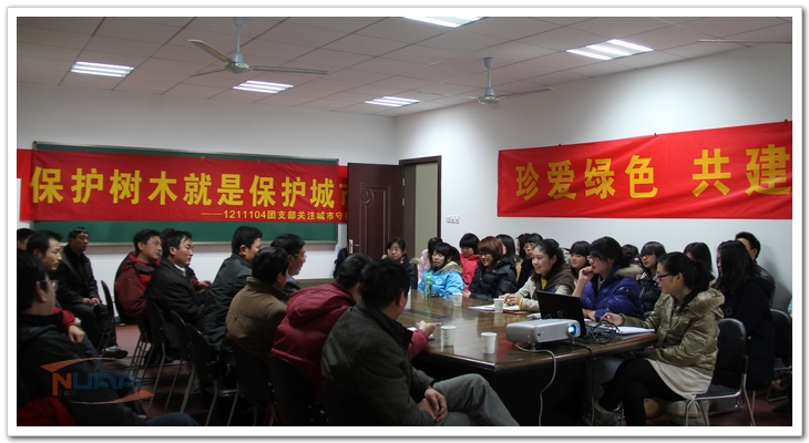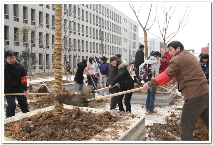 3月12日下午,外国语学院10、11级本科生联合党支部,1211104团支部与后勤集团校园服务中心党支部开展了主题为“珍爱绿色•共建家园”的植树节支部共建活动。后勤集团副总经理周道贵、校园服务中心党支部书记王安平和外国语学院党委副书记庞小燕参加了此次活动。 活动分为座谈和植树两个阶段。座谈会上,参会教职工和学生以南京梧桐树迁移事件为背景,针对城市环境和校园环境建设展开了讨论。两代人各自引述自己年代所发生的环保事件,阐述心得,交流感受。通过老师的介绍,学生对南京城市建设、梧桐树的迁移与保护等方面有了更加全面的认识;学生也结合自己在校园学习、生活的体会对校园环境建设提出了自己的建议与期望。