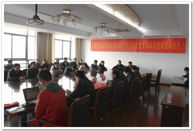 2012年3月14日下午,航空宇航学院土木工程专业本科生党支部纵向建制启动仪式在18号楼会议室举行。出席此次启动仪式的有航空宇航学院党委书记李明成,副书记孙占久等相关负责人。土木工程专业09、10、11级本科生学生党员共23人全部参加此次启动仪式。 孙占久就为何要建设土木工程纵向党支部作了说明,他分析了现今党支部建设的各种模式,而纵向建设党支部可以保证支部存在的时间和文化的传承。
