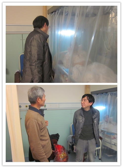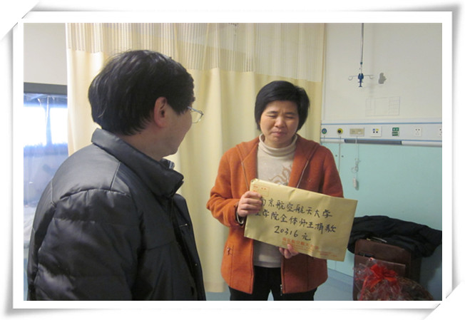 3月22日下午,理学院院长施大宁教授、院长助理王静、物理系党支部书记李晋斌等一行六人,看望慰问正在住院治疗的理学院应用物理专业学生于进。院长施大宁代表学院党委向于进同学赠送了慰问品,将前期全院募集到的20316元钱捐款送到了于进同学亲人的手中,鼓励于进安心养病,战胜病魔,早日康复回到老师同学们身边。病床上的于进,忍受着化疗带来的各种不良反应,脸色苍白如纸,但床头依然摆放着量子力学等专业课书本,内心依然充满对知识的渴求,依然充满着对美好大学生活的向往。在病房里,理学院的老师们仔细听取了主治医生对于进病情的介绍并详细询问了治疗情况。杨秀群医生介绍,于进的一期的化疗已经结束,但治疗情况没有达到预期的效果,在休养一段时日后,于进将再次接受化疗。 于进同学是理学院应用物理专业学生,2009年以优异的成绩从安徽省南陵县第一中学考入我校。在校期间,于进同学表现突出,积极参加各类文体活动和学生工作,深得同学们的喜爱,曾荣获学院“优秀团员”称号。他患病的消息传出后,院系领导、老师、同学都十分关注。理学院团委、0809团总支向全校师生及社会发出“SOS紧急爱心呼叫援助”的倡议,得到了全校师生的大力支持,3月4日艺体广场“爱心洒满校园,献血点亮生命——于进,我们愿和你一路同行”青年学子献血献爱心活动,8小时306名南航学子共计献血量达8万毫升。校学生资助管理中心积极联系江苏省慈善总会,研究生院副院长沈以赴教授帮助联系社会企业江苏柯菲平医药有限公司,均对于进给予了一些的爱心资助。