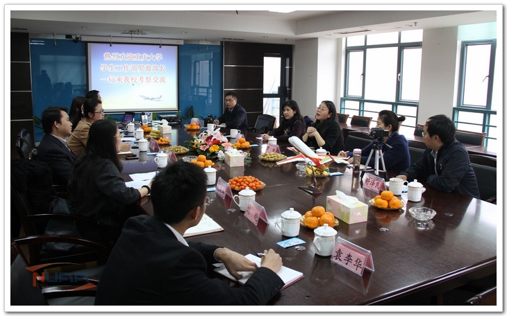 3月29日,重庆大学学工部副部长罗滌一行5人来我校考察交流。将军路校区管委会主任刘宇雷、学生处副处长侍旭、校团委及学生处各科室负责人参加了交流会。 会上,双方围绕资助政策落实、资助育人、学生创业、公益活动以及学生工作中的实际问题进行了交流和探讨。侍旭对学生处的基本情况进行了介绍,并详细介绍了我校重点推出的“群星计划”以及在评优评奖方面的创新性做法;学生资助管理中心刘红旗介绍了我校经济困难学生资格认定体系、学生勤工助学情况、获贷学生诚信感恩教育以及资助育人方面的情况,就业指导中心创业部部长吴庆春对我校学生创业的平台搭建、科技支撑和经费支持等方面进行了介绍;校团委王亚鹏就我校公益活动开展情况进行了介绍。