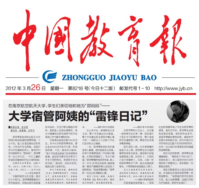 3月26日《中国教育报》12版刊登题目为《在南京航空航天大学,学生们亲切地称她为“邵妈妈”——大学宿管阿姨的“雷锋日记”》的新闻通讯,报道了我校将军路校区怡园22栋宿舍楼宿管阿姨邵秀琴爱岗敬业的事迹。