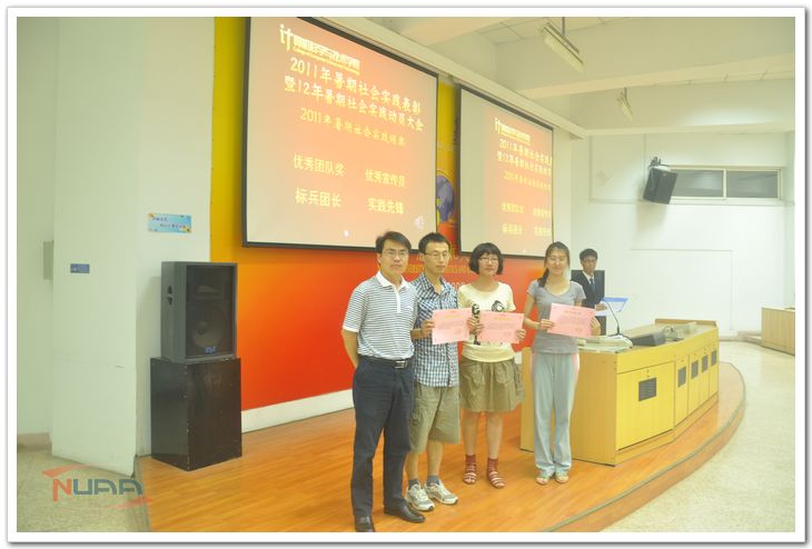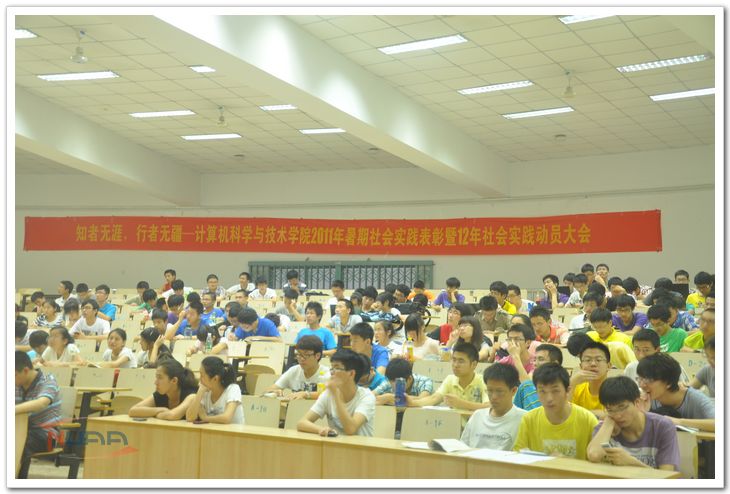 2012年6月10日晚7点,“智者无涯,行者无疆”计算机科学与技术学院2011年暑期社会实践获奖团队表彰展示暨2012年暑期社会实践动员大会在将军路校区举办。院党委副书记王国军、院团委书记阙愚以及各年级辅导员参加了此次活动。 到场嘉宾为学院去年在暑期社会实践中表现突出的优秀宣传员、标兵团长、实践先锋及优秀团队进行了颁奖。阙愚作2012年暑期社会实践的要点讲解,分别从选题、初步策划、组建团队及制定方案四个方面来具体讲解暑期社会实践的策划及组织方法,并向同学们公布了今年校院两级暑期社会实践活动的重点申报方向。去年获得校暑期社会实践明星团队和优秀团队的五支队伍向同学们进行实践成果视频展示,并设置了同学提问环节,同学们纷纷提出了对暑期社会实践的设想和疑问。会议最后,院党委副书记王国军为11级学生作2012年暑期社会实践动员,获得了同学们的热烈反响。至此,大会在热烈的掌声中圆满落下帷幕。