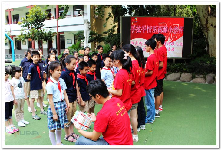 6月21日上午,在南京市御道街小学操场上举行了由该小学和我校“格桑花开”西藏支教团队共同举办的“手拉手”图书捐赠仪式,自动化学院党委书记沈伯秀、御道街小学高校长等领导嘉宾出席了仪式。 仪式上,小学一到五年级的小同学代表们分别向支教团的大哥哥大姐姐送上了捐赠的图书和给西藏小朋友们的祝福。