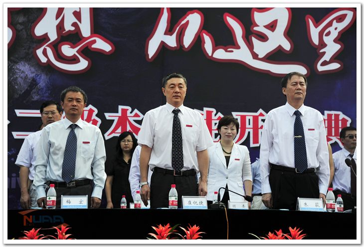 金秋九月,鲜花绽放,收获的季节里4538名2012级新生迎来了自己的庆典。9月11日上午,“飞天的梦想,从这里起航” 2012级本科生开学典礼在我校将军路校区西田径场隆重举行。校党委书记崔锐捷、校长朱荻、党委副书记、副校长陈夏初、纪委书记吴庆文、副校长宣益民、吴庆宪、许希武,校长助理熊克、黄炳辉等校领导出席了本次典礼。我校84届杰出校友、中国科学院院士、北京大学信息科学技术学院院长梅宏教授和江苏省淮阴中学张元贵校长也应邀出席。参加典礼的还有校党政办公室、研究生院、学生工作处、教务处、校团委、将军路校区管委会等部门负责人以及各学院领导、教师代表、家长代表。典礼由陈夏初同志主持。 开学典礼在视频《走进南航这片土地》拉开了帷幕,同学们跟随视频了解了学校的建设与发展历程,随后在庄严的国歌声中进行了升国旗仪式。校长朱荻代表学校欢迎新生进入南航学习、生活,校长朱荻代表学校欢迎新生进入南航学习、生活,并结合我校"团结、俭朴、唯实、创新"的校风对新生提出了要求与希望。在院长致辞环节中,14个学院的领导纷纷登台,用富有学院特色的语言表达了对新生的欢迎和期望,台下新生与院领导进行了热烈的互动,掌声、欢呼声此起彼伏,将典礼推向了高潮。梅宏院士作为校友代表与新生们分享了他在南航的大学生活和追梦之旅,他诙谐幽默、睿智而又贴近大学生生活的讲话,引起了学生的强烈共鸣,让广大新生获益匪浅。江苏省淮阴中学校长张元贵老师作为中学校长代表为全体12级新生送上了寄语。