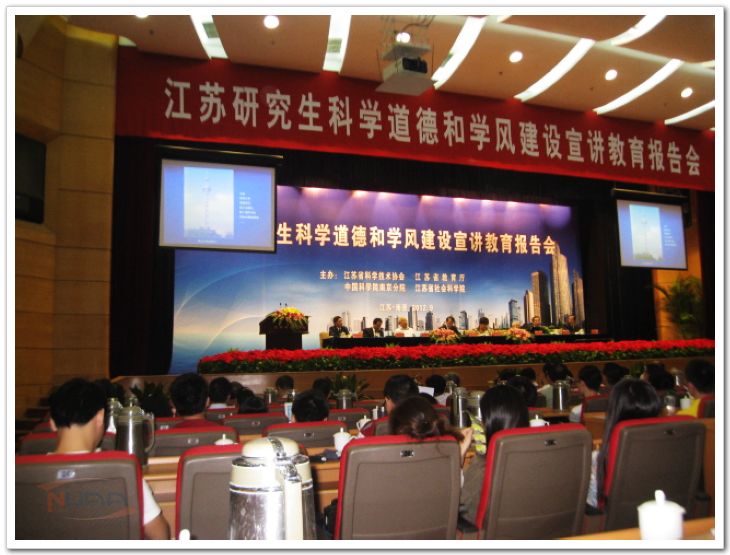 江苏研究生科学道德和学风建设宣讲教育报告会由省科协、省教育厅、中科院南京分院、省社会科学院联合举办。会上省教育厅长沈健出席报告会并发言。省科协、省社科院相关领导出席了报告会。江苏省内研究生培养单位的相关负责人及南京地区高校共700余人在现场听取了宣讲教育报告会。本场宣讲教育结束后,省内各研究生培养单位将陆续举行科学道德和学风建设宣讲教育。我校也将开展一系列科学道德和学风建设宣讲教育活动。