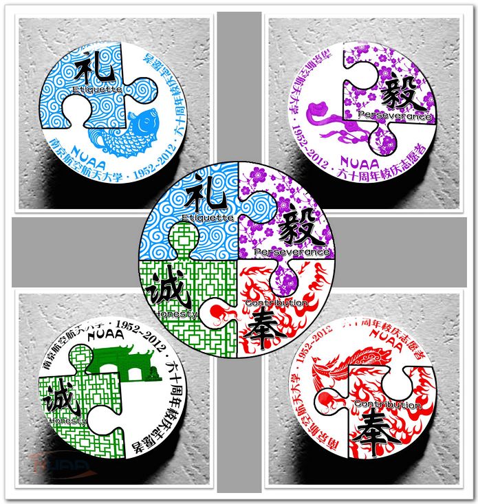 晷曜司文、荟萃高阁、绿染湖堤、扶摇直上……透过一枚枚小小的徽章,一个学校独特的风景和人文底蕴被生动得展现出来。在南京航空航天大学60周年校庆志愿者动员大会的现场,记者见到了该校学生为校庆60周年志愿者设计的校庆徽章,这些兼具南航特色和诗意名称的徽章获得了在场同学的追捧。 投票选出的南航校园内最受欢迎的八个景点被设计到了工作章上:栖息在江宁校区大西门草坪上的直升机、坐落于明故宫遗址之上的日晷仪、承载着南航厚重的历史的荟萃楼……大三女生吴海月是徽章的设计者之一,从创意到设计,从拍摄到后期制作,她和其他两位同学花了三个多月的时间来制作这套志愿者徽章,经过层层筛选和修改,作品最终获得到了师生的一致肯定。“虽然我没有报名志愿者,但是这也算是为学校的志愿活动做了一点贡献吧!”她说道。而一枚枚富有诗意的徽章名称则是被誉为“南航才子”,《南航赋》的作者—大四学生张李所题。