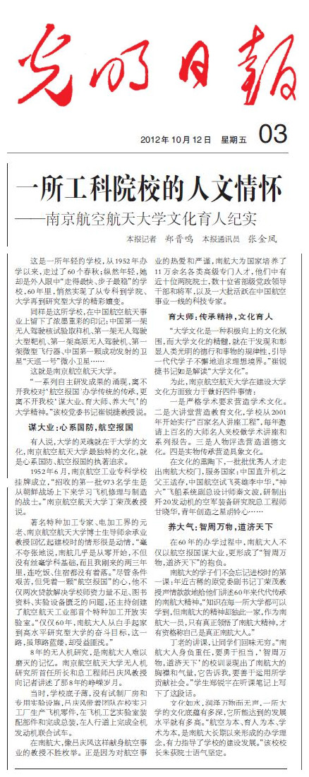 随着我校60周年校庆的临近,各媒体从不同角度陆续刊载我校60年发展建设的报道。10月12日《光明日报》要闻版以《一所工科院校的人文情怀》为题报道了我校文化育人工作,全文转载如下: 一所工科院校的人文情怀 南京航空航天大学文化育人纪实 这是一所年轻的学校,从1952年办学以来,走过了60个春秋;纵然年轻,她却是外人眼中“走得最快、步子最稳”的学校,60年里,悄然实现了从专科到学院、大学再到研究型大学的精彩嬗变。 同样是这所学校,在中国航空航天事业上留下了浓墨重彩的印记:中国第一架无人驾驶核试验取样机、第一架无人驾驶大型靶机、第一架高原无人驾驶机、第一架微型飞行器、第一颗自主研制的“天巡一号”微小卫星…… 这就是南京航空航天大学。 “一系列自主研发成果的涌现,离不开我校对‘航空报国’办学传统的传承,更离不开我校‘谋大业、育大师、养大气’的大学精神。”该校党委书记崔锐捷教授说。 谋大业:心系国防,航空报国 有人说,大学的灵魂就在于大学的文化,南京航空航天大学最独特的文化,就是心系国防、航空报国的执著追求。 1952年6月,南京航空工业专科学校挂牌成立,招收的第一批973名学生是从朝鲜战场上下来学习飞机修理与制造的战士。 著名特种加工专家、电加工界的元老、南京航空航天大学博士生导师余承业教授回忆起建校时的情形很是动情,“毫不夸张地说,南航几乎是从零开始,不但没有丝毫学科基础,而且我刚来的两三年里,连吃饭、住宿都没有着落。”尽管条件艰苦,但凭着一颗“航空报国”的心,他不仅两次贷款解决学校师资力量不足、图书资料、实验设备匮乏的问题,还主持创建了航空航天工业部首个特种加工开放实验室。“仅仅60年,南航大人从白手起家到高水平研究型大学的奋斗目标,这一路,虽筚路蓝缕,却受益匪浅。” 当年的无人机研究,是南航人难以磨灭的记忆。南京航空航天大学无人机研究所首任所长和总工程师吕庆风教授向记者讲述了那些年的峥嵘岁月。 当时,学校底子薄,没有试制厂房和专用实验设施,吕庆风带着团队在校实习工厂生产飞机零件,在飞机工艺实验室装配部件和完成总装,在人行道上完成全机发动机联合试车。 在南航大,像吕庆风这样献身航空事业的教授不胜枚举。正是因为对航空事业的热爱和严谨,南航大为国家培养了12万余名各类高级专门人才,他们中有十多位两院院士,数十位省部级党政领导干部和将军,以及一大批活跃在中国航空航天事业一线的科技专家。 育大师:传承精神,文化育人 “大学文化是一种积极向上的文化氛围,而大学文化的精髓,就在于发现和彰显人类光明的德行和事物的规律性,引导一代代学子不懈地追求理想境界。”崔锐捷书记如是解读“大学文化”。 为此,南京航空航天大学在建设大学文化方面致力于做好四件事情: 一是严格学术要求营造学术文化。二是大讲堂营造教育文化,学校从2001年开始实行“百家名人讲座工程”,每年邀请上百名的大师名人来校做学术讲座和系列报告。三是人物评选营造道德文化。四是实物传承营造具象文化。 在文化的熏陶下,一批批优秀人才走出南航大校门,服务国家:中国直升机之父王适存,中国航空试飞英雄李中华,“神六”飞船系统副总设计师秦文波,研制出歼20发动机的空军装备研究院总工程师甘晓华,青年创造之星胡铃心…… 养大气:智周万物,道济天下 在60年的办学过程中,南航大人不仅以航空报国谋大业,更形成了“智周万物,道济天下”的抱负。 南航大的学子们不会忘记进校时的第一课:年近古稀的原党委副书记丁荣茂教授声情款款地给他们讲述60年来代代传承的南航精神。“知识在每一所大学都可以学到,但南航的精神却独此一家,作为南航一员,只有真正领悟了南航精神,才有资格称自己是真正南航人。” 丁老的讲课,让同学们回味无穷。“南航人身负重任,要勇于担当,‘智周万物,道济天下’的校训表现出了南航的胸襟和气量,它告诉我,要善于运用所学贡献社会。”学生郑锐宇在听课笔记上写下了这段话。 文化如水,润泽万物而无声,一所大学的文化底蕴有多深,它所能达到的发展水平就有多高。“坚持‘以育人为本,促进人才辈出;以学术为本,促进学术繁荣;以航空为本,促进特色发展’,是南航长期以来形成的办学理念,有力指导了学校的建设发展。”该校校长朱荻院士语气坚定。