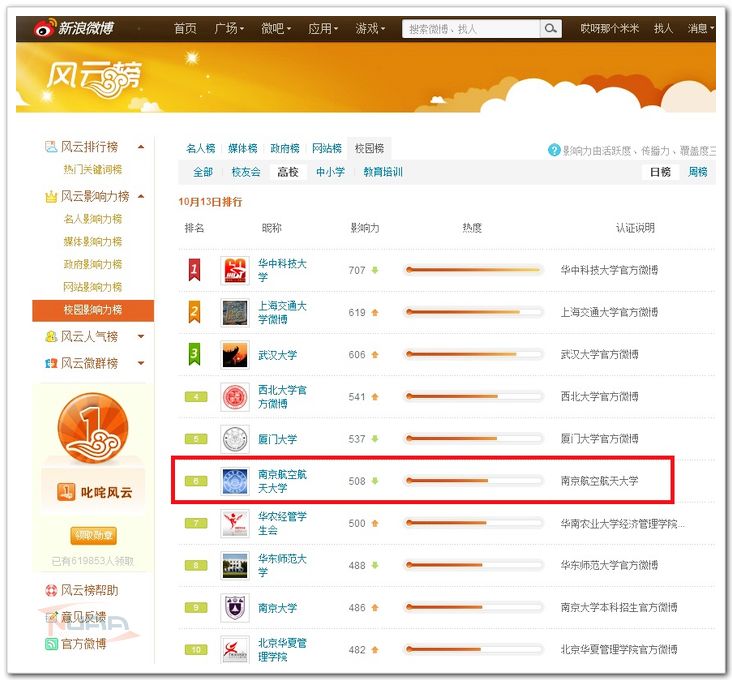 在近期的新浪微博影响力(高校部分)百强评比中,我校微博(@南京航空航天大学)入围校园微博影响力榜,名列全国第六,江苏第一,成为影响力较大的官方微博之一。
