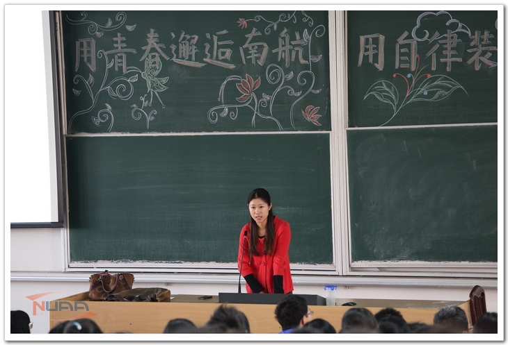 9月18日晚,经济与管理学院组织新生聆听了校关工委常委副主任丁荣茂关于南航跨越发展与办学传统的报告。同学们被南航六十年的奋斗史所感动,更加深刻的理解了负重奋进、献身国防、唯实创新、志在超越的南航精神。 10月19日上午,经济与管理学院2012级学生自律宣誓仪式在将军路校区教室举行。此次仪式旨在回顾南航发展史,笃行自律自强精神,庄严签署协议,行动献礼南航校庆。 在仪式上,辅导员刘旭提出“用青春邂逅南航,用自律装点青春”的主题。南航发展史的短片带领全体12级学生共同回顾南航这60年以来的跨越式发展。通过对王适存、李中华、胡铃心等新老南航人的光荣事迹、南航对中国航空航天民航事业的贡献以及校园建设的变化的展示,学生们充分了解南航“谋大业——心系国防,航空报国”的抱负,“育大师——传承精神,文化育人”的决心,“养大气——智周万物,道济天下”的坚持。 由中心组团总支全体成员组成的自律委员会带领大家庄严承诺,宣誓自律,响亮而整齐的声音饱含了大家的热情与决心。经济与管理学院2012级全体学生庄严签署了《南京航空航天大学学生自律协议书》,铮铮誓言代表了同学们立志成才的决心,全体新生以这种方式庄严向南航献礼。