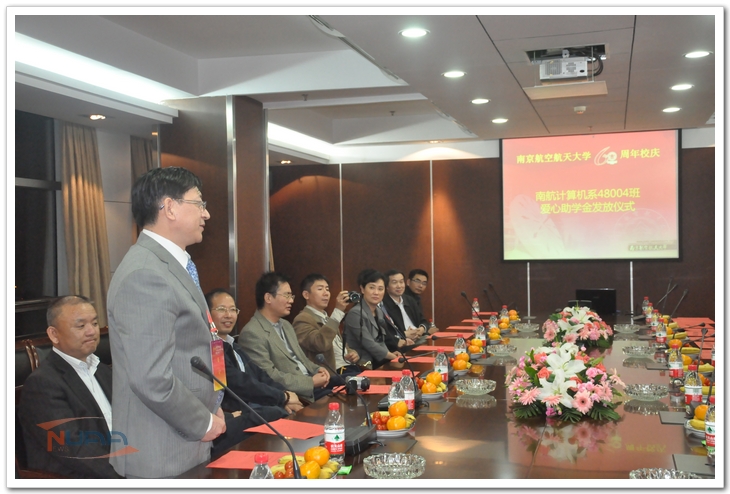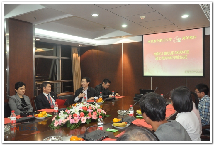 10月20日,在全校上下欢庆南航六十周年华诞之际,我校计算机系48004班校友爱心助学金发放仪式在将军路校区举行,张云峰、吕军、梅宏等48004班校友代表,计算机科学与技术学院党委书记江国华、院党委副书记王国军以及10名受助学生参加发放仪式。 江国华首先对48004班校友回馈母校表示感谢,对受助学生提出了明确要求,并勉励同学们节俭用钱、勤奋学习。随后进行了助学金发放仪式,10位受助学生分别从10位校友手中接过了寄托着48004班全体校友爱心和希望的每人3000元助学金。 48004班班长张云峰先生表示这笔助学金是48004班所有同学的心意,尽管有些校友并不是很富裕,但为支持母校的教育工作,还是慷慨解囊,真心希望同学们能够珍惜今天的生活、珍惜大学生活。最后,校友们与受助学子围绕大学学习生活、目标规划、今后就业方向等进行了座谈交流,大家相互交换了联系方式,进行现场结对,校友们表示今后将继续与此次受助的学子们保持联系,用自己的成长经历和人生体会去教育引导学弟学妹们更好地成长发展。