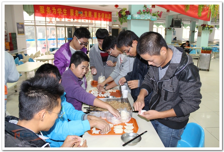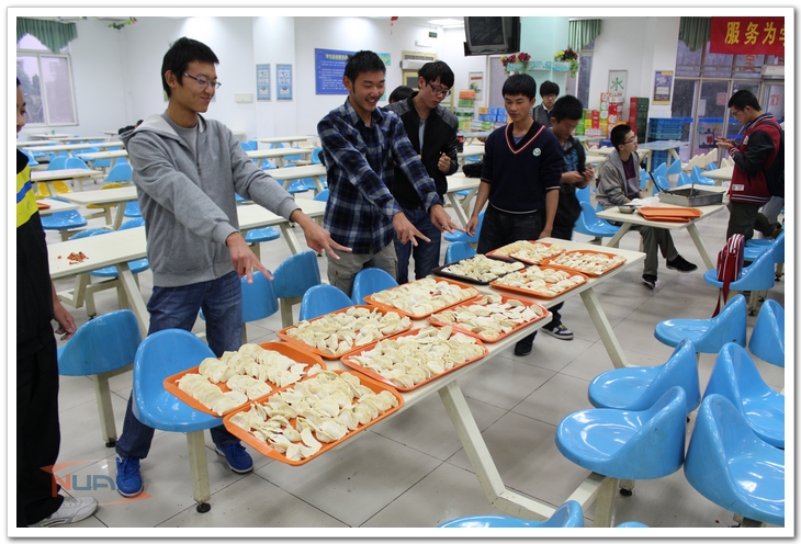 寒风乍起,立冬来临。11月7日,时处秋冬之交,立冬自古在北方便有吃饺子的习俗。离家两个月,想家的心情在这个立冬时节就倍感强烈,在这种情感的促发下,民航/飞行学院的新生自发地组织了包饺子、吃饺子活动,来感受家的温暖。 下午3点45分,下课铃声响起,同学们迫不及待地奔向食堂,争先恐后地处理食材,准备包饺子。别看民航学院机务工程都是帅小伙,包饺子的功力丝毫不逊色于女生。左手托饺子皮,右手填馅,蘸水,封口……一板一眼,有模有样。辅导员也前来助阵,大显身手。大家兴致颇高,饺子的数量也在不断增加。不一会儿,各式各样的饺子充盈了桌子,包子形、飞碟形、菊花形……虽然饺子形状千奇百怪,但在笑声中,大家忘却了自己略显笨拙的手法,忘却了节日无法与家人团聚的失落,此时此刻,同学便是亲人,民航/飞行学院就是家!许多同学受到现场氛围的影响拿起电话,提醒父母立冬要吃饺子,告诉他们自己亲手包饺子的事,浓浓的感恩之情洋溢。