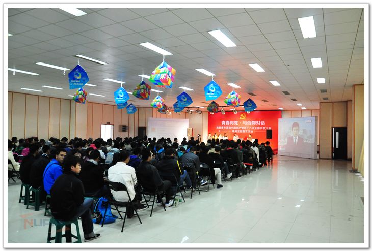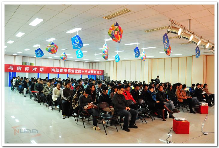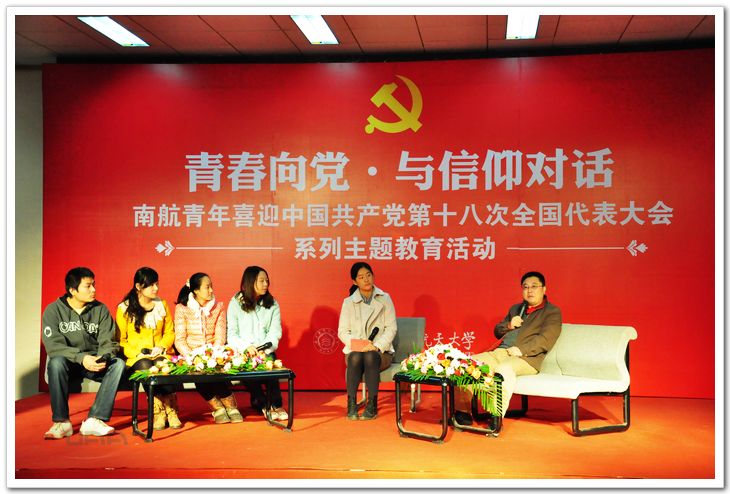 由党委宣传部、学生处、校团委主办的“青春向党”南航青年喜迎中国共产党第十八次全国代表大会现场直播活动11月8日上午8点半在我校将军路校区艺术中心多功能厅举行。校学生会等各校级学生组织同学、少数民族同学代表、电子信息工程学院、经济与管理学院、人文与社会科学学院的近200名青年学子济济一堂,以青春思辨会、观看大会直播、微博寄语互动等形式喜迎党的十八大胜利召开。 “从国产大飞机项目,到神舟系列载人飞船、嫦娥探月工程、天宫一号,过去的10年间在党的领导下,祖国航空航天事业取得了巨大成就。作为祖国航空航天事业未来的建设者,我们感到使命光荣,责任重大”。在直播前的青春思辨会中,校思辨队同学们一起畅谈10年来祖国的变化、展望十八大美好愿景。人文与社会科学学院院长平旭为同学们精彩点评并给予建议。