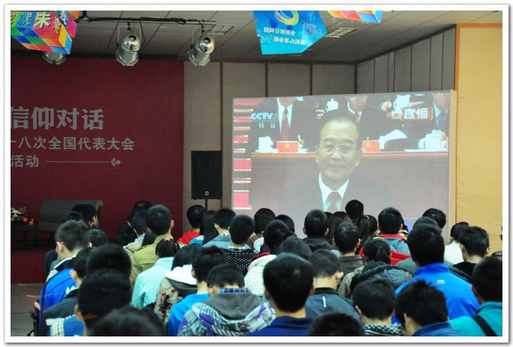 在大会直播过程中,同学们认真观看、聆听、学习胡锦涛总书记的报告,现场不时发出热烈的掌声。直播现场一侧的#青春向党 铭记一句话#微博墙实时更新着同学们对十八大的期望和祝福:“十年一眨眼,在我成长的同时,也见证着祖国日新月异的变化”;“中国特色社会主义伟大事业是面向未来的事业,需要我们一代又一代有志青年不懈奋斗。”“祝党的十八大圆满召开,祝人民越来越幸福”;一条条微博跃然屏幕,我校的青年学子用青春时尚的方式表达着浓浓的爱国爱党之情。