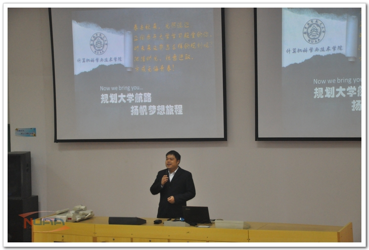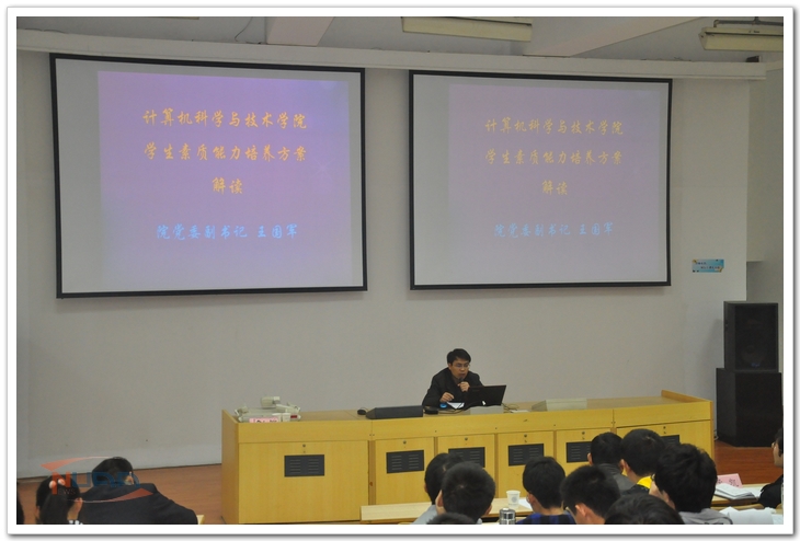 11月8日晚,“规划大学航路,扬帆梦想旅程”计算机科学与技术学院学生素质能力培养方案宣讲暨2012级公开月讲评在将军路校区举行。计算机学院党委副书记王国军以及2012级全体同学参加活动。活动由学院2012级辅导员唐志文主持。 活动中,王国军从培养目标、培养要求、培养办法、考核认定办法、考核结果使用等方面向同学们详细解读了《计算机科学与技术学院学生素质能力培养方案》,并结合实例对十二项素质能力进行解读,鼓励同学们争当“高素质公民和未来开拓者”。 四位新生代表上台展示了自己对大学四年的规划和设想,嘉宾老师进行了精彩点评,激发学生自主规划大学生活,引导学生学会合理规划,正确选择大学之路。校党委委员、机电学院在读博士孟凯与同学们分享了自己的成长故事,并希望同学们能做到四个“用心”:用心去准备、用心去思考、用心去磨练、用心去体验,他的幽默与才智博得现场同学阵阵掌声。辅导员王小青从专业理论角度对学生进行大学规划指导,从实践途径分析让同学们了解更多做好自身定位和未来规划的方法,并开展了有趣的互动游戏。