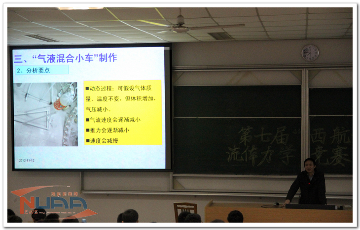 谭慧俊教授结合历届作品的图片指出了往年参赛选手经常出现的问题,并针对水重力驱动小车以及气液混合驱动小车的制作给同学们做了详细地指导,耐心地介绍了有关流体力学方面的知识。通过谭慧俊教授的指导,同学们明白了结合理论知识的重要性,并对作品的制作有了更深层次的了解。之后,由上届专业组和业余组第一名两位同学也与大家交流了各自的参赛经历。