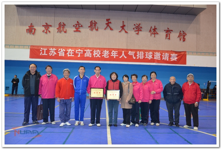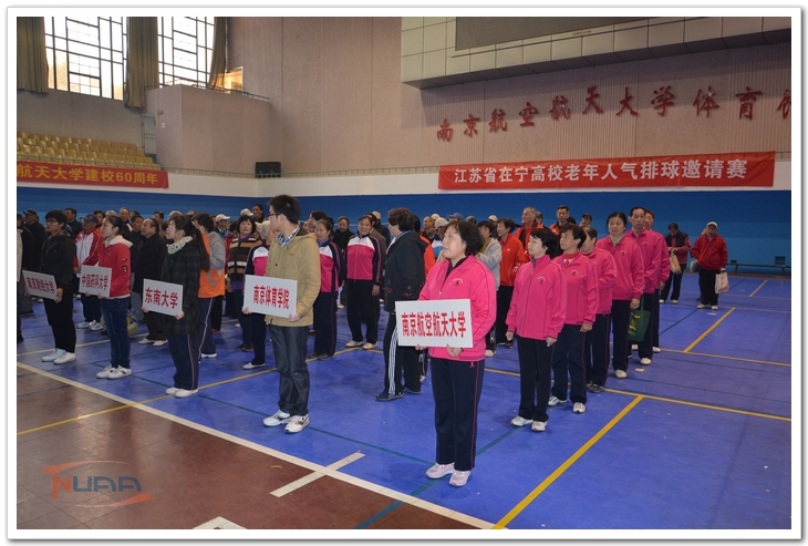 11月17日,我校承办的“2012年江苏省在宁高校老年人气排球邀请赛”在南航明故宫校区体育馆如期举行。开幕式由我校离退休处处长刘虎主持,江苏省在宁高校老年人体育协会常务副理事长、我校老年人体育协会理事长刘明浚致欢迎辞并宣布赛会开幕,江苏省在宁高校老年人体育协会秘书长王心涛等领导出席了开幕式。