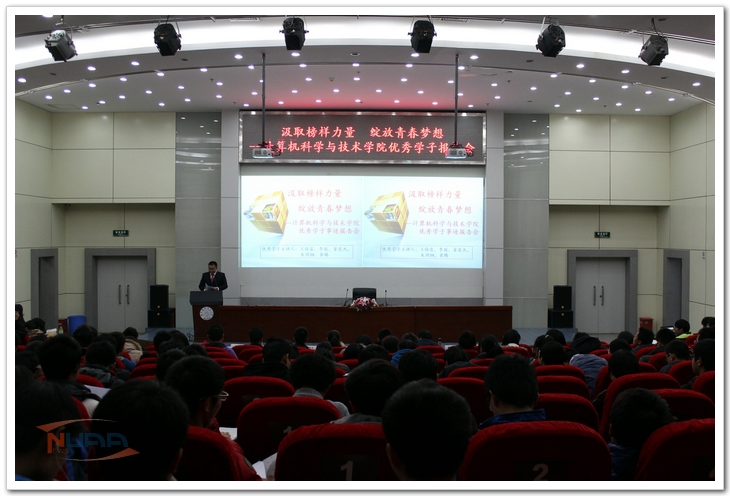 12月13日晚,计算机科学与技术学院“汲取榜样力量,绽放青春梦想”优秀学子报告会暨学习经验交流会在将军路校区举行。来自不同学院的5名优秀学子作为嘉宾到场为同学们讲述成长经历。学院团委书记阙愚,各年级辅导员以及400多名学生到场参与。 活动开篇由“学习之星”航空宇航学院崔腾、“实践先锋”经济与管理学院李骏、“思拓精英”人文与社会科学学院董英杰为同学们做经验介绍,他们从自身的成长经历出发,就人生理想、大学目标、学习动力、学习态度、学习方法、工作实践、人文素质的培养等方面向同学们介绍了成功的经验。主持人对电子信息工程学院王镇雷、计算机科学与技术学院朱剑钢进行了现场访谈,在轻松愉快的氛围中两位大四优秀学子通过生动的故事讲述了如何培养优秀的学习和生活习惯,如何处理好学习与工作的关系,如何开展科学创新研究等,“校园十佳歌手”王镇雷还为同学们现场演唱。学院2012级学习经验交流会上,由数学期中考试满分获得者毛冰城,信息学特长生孙珂、宋业伟向2012级同学介绍了学习高等数学和程序设计语言的经验。