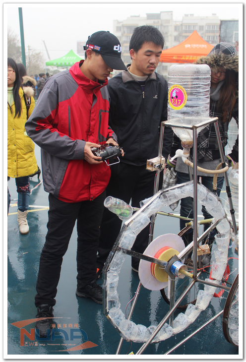 本次大赛共有140余支队伍报名参赛,竞赛以“超越•创新•实践•挑战”为主题,沿承了上届比赛“水动力驱动小车”和“气液混合动力驱动小车”两个项目,为同学们提供广阔的思考、创新空间。大赛沿用专业组和业余组分层次比赛的形式。比赛当日,同学们都积极向各位专业老师们阐述自己作品的运动原理、制作过程等,并将各自最优异的成绩展现出来。最终,水动力驱动专业组方面,“疯狂的小明”水重力小车以绕圆534度的成绩夺得小车项目的冠军。队长袁伟介绍,小车车身主要采用碳纤维材料,配置了遥控调向的轮转装置和调节水流量的压力装置。而专业组其他参赛选手的精彩表现也得到了在场评委的高度赞扬。“水使者”队以独特的旋转设计,获得了最佳创新奖。在水动力驱动业余组方面,“风行队”以巧妙的构思和独特的动力设计获得了最佳创新奖,并以60.1米的成绩获得了此项目最终的冠军。在气液混合动力组方面,“行路者”小车以45.75米的成绩获得了冠军。赛场上,随处可见参赛选手彼此讲解自己的作品,并与专家评委展开积极互动交流的场景。最终,本届流体力学创新型设计实验竞赛在一片喜悦的氛围之中圆满落下了帷幕。