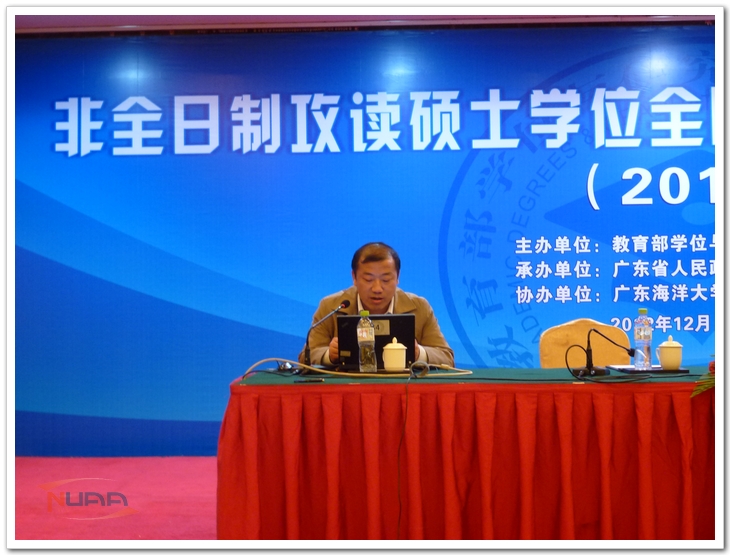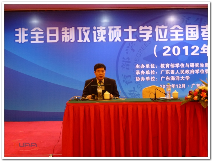 非全日制攻读硕士学位全国考试考务工作年度会议于12月14日至16日在广东湛江召开。国务院学位委员会办公室、教育部学位与研究生教育发展中心有关负责人出席会议。全国各省学位办和教育考试招生机构及高校代表参加了会议。 江苏省由省学位办主任、我校博士生导师杨晓江教授带队,研究生院副院长沈以赴教授作为江苏考区考务工作实际承办单位和南京大学,东南大学,南京理工大学,南京师范大学等考点单位代表参加了会议。 会议总结了2012年在职人员攻读硕士学位全国联考(简称全国联考)工作,杨晓江作为先进单位代表进行了大会交流发言,充分肯定了我校作为江苏考区考务工作具体承接单位所做出的努力和突出贡献,沈以赴作为考务材料回收先进单位代表做了大会发言。