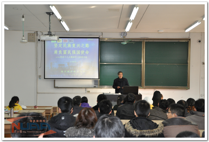 12月19日下午,航天学院在明故宫校区举行十八大精神学习报告会。特别邀请了学校关心下一代工作委员会常务副主任丁荣茂为全院教职工和学生作报告。报告会由航天学院党委副书记戴泉晨主持,学院党委书记刘建成在报告后做总结发言。 丁荣茂从十八大会议主题和胡锦涛《坚定不移沿着中国特色社会主义道路前进,为全面建成小康社会而奋斗》的报告切入,带领全体老师和同学学习了十八大报告的新论断、新阐述、新定位、新目标、新部署、新要求等亮点,内容全面深刻,思想脉络清晰,立意高远,内涵丰富。 丁荣茂用图文并茂的形式,以全新的视角,生动地为全院教师和学生解读了“十八大”精神,通过全面审视世界与中国大势的科学分析、坚守中国发展道路的政治宣言、科学发展观的历史定位、全面建成小康社会的庄严承诺、执政党建设科学化水平全面提高的新要求、寄望青年勇于担当使命与责任等六个方面,详细地讲述了中国共产党领导中国人民取得的伟大成就,以及在未来发展过程中,党和人民所肩负的伟大历史使命。 刘建成在总结发言中再次强调,不论是普通教师还是学生,都应该深入学习贯彻十八大精神,牢牢把握“学习”、“责任”、“担当”、“奉献”、“践行”等关键词,将思想和行动自觉地与党和国家的要求相统一,深刻理解和贯彻丁荣茂对全体师生的寄语,深切感悟发展,坚实开创未来,将文化知识学习和思想品德培养紧密结合,创新思维和社会实践紧密结合,全面发展和个性发展紧密结合,个人志向和社会需要紧密结合。作为一个南航人,作为一个航天人,我们更要积极响应党的号召,树立正确的世界观、人生观、价值观,不断创新科学研究方法,发挥好高校在人才培养、科学研究、社会服务以及文化传承与创新中的重要作用,不断加强自身的理论与专业素养,为我们肩负的富民强国的使命而不断奋斗。