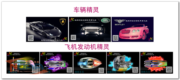 汽车精灵的设计者丁一同学对三款车辆专业精灵的设计理念进行了详细介绍。它们分别是兰博基尼、路虎以及宾利,三个顶尖汽车品牌代表了不同的品牌精神,汽车机械所带给人的那种摄人心魄的金属感让每一位车辆人为之痴迷。五款精灵分别是涡轴能能、涡桨媛媛、微喷玉玉、涡扇东东、涡喷力力,采用五种类型发动机的剖图作为主要内容,并编辑二维码储存发动机相关信息,发动机命名取自“能源与动力”的谐音。