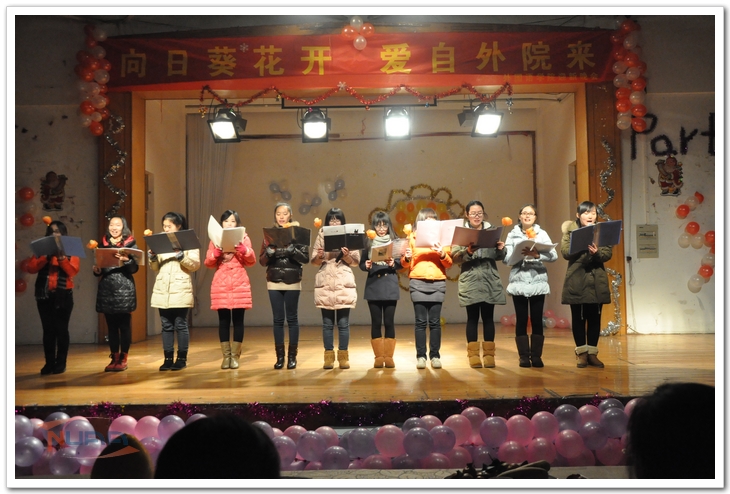 12月26日晚,外国语学院“向阳花开”2013年迎新晚会在将军路校区上演。院党委副书记庞小燕、院团委书记赵铮和全体辅导员到场,与200余名同学共同联欢。 整场晚会以“向阳葵花开,爱自外院来”为主题,独具创新地以反映学生成长历程的一幕幕话剧串场,配以现场近百张学生们从小到大不同时期的照片布置,“成长”的寓意贯穿晚会始终。 晚会上,大一班级的风采展示,无论是舞蹈、合唱,还是动画配音,无不展现出外院学子团结、朝气、活力、阳光的形象。大二年级的诗朗诵,一首首献给老师的赞歌,诉说出学生对老师的感激,让浓浓的师生情谊在现场回荡。由庞小燕领衔,全体辅导员共同表演的舞蹈,更是将晚会的气氛推向了高潮。话剧《甄嬛外传》、极具民族特色的日本舞表演,十佳歌手的精彩演唱,富有古典韵味的舞蹈《桃夭》,也让晚会现场叫好声不断,笑声连连。 ![]() ![]() ![]() |
