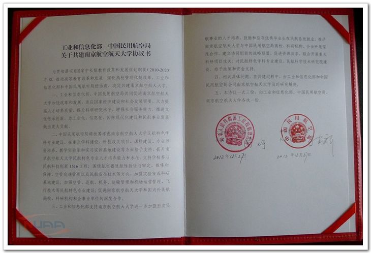 2012年12月27日,工业和信息化部与中国民用航空局共建南京航空航天大学协议在北京正式签署。根据中央八项规定要求,此次协议的签署不举办任何仪式,由工业和信息化部苗圩部长与中国民用航空局李家祥局长代表双方分别在协议书上签字。部局共建协议的签署是我校落实“坚持以航空为本,促进特色发展”办学理念的重大举措,是我校进一步彰显民航特色发展的重要里程碑,为我校的建设发展创造了更广阔的空间。