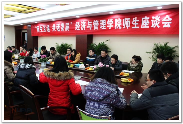 为了加强师生间的沟通,增进师生间的感情,方便学生适时反映学习生活中的问题,帮助老师及时了解学生的学习现状及生活动态,从而打造更为活跃的经管氛围,培养更为卓越的商理精英,经济与管理学院于12月28日下午在将军路校区召开了“师生互通,共话发展”师生座谈会。院党委书记李遥,副院长张卓、王英、朱建军,院长助理许静,各年级辅导员以及23名来自各系部、各年级的学生代表参与了此次座谈会。