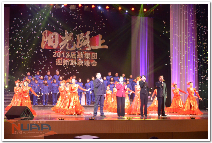 欢歌笑语辞旧岁,金蛇狂舞贺新春。12月28日晚,“阳光路上”2013年后勤集团迎新联欢晚会在明故宫校区大学生活动中心举行。宣传部、纪委、监察处、校工会、航空宇航学院、人文与社会科学学院、继续教育学院、经济与管理学院等相关部处负责人以及集团党政领导、离退休老领导,全体员工共聚一堂,星光璀璨的礼堂内座无虚席,洋溢着欢快喜庆的新年气息。