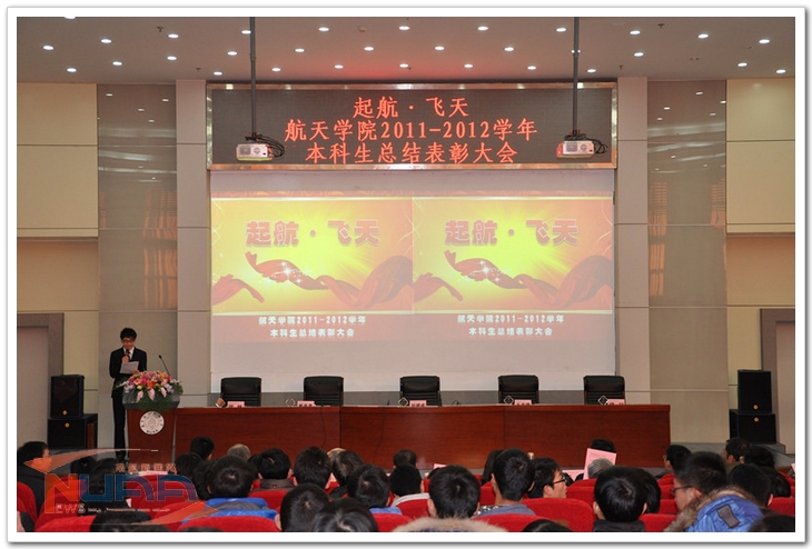 12月30日下午,航天学院于将军路校区举行了“起航·飞天”2011-2012年度本科生总结表彰大会。航天学院党委书记刘建成、副院长王志瑾、党委副书记戴泉晨、校团委副书记张林、校学生处处长助理徐川,以及航天学院全体老师参加了此次大会。