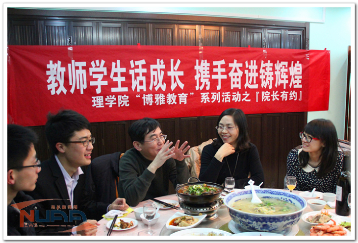 1月4日晚,理学院党委书记余春玲、院长施大宁携全体院系领导,邀请本科生班主任,研究生导师代表,博雅导师代表,优秀本科生、研究生代表等共40余人,共进晚餐,共话成长。此次“院长有约”共餐会是理学院“博雅教育”系列活动的一部分,为学院师生创造了一个轻松自如、畅所欲言的场景和氛围,也为院领导及时了解学生思想动态,走进学生内心世界,准确把握学生的脉搏提供了契机。