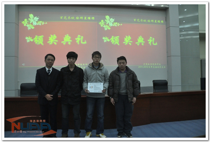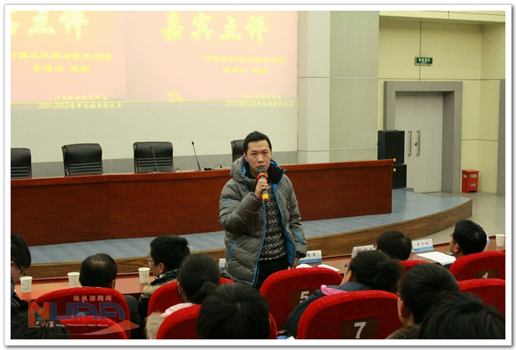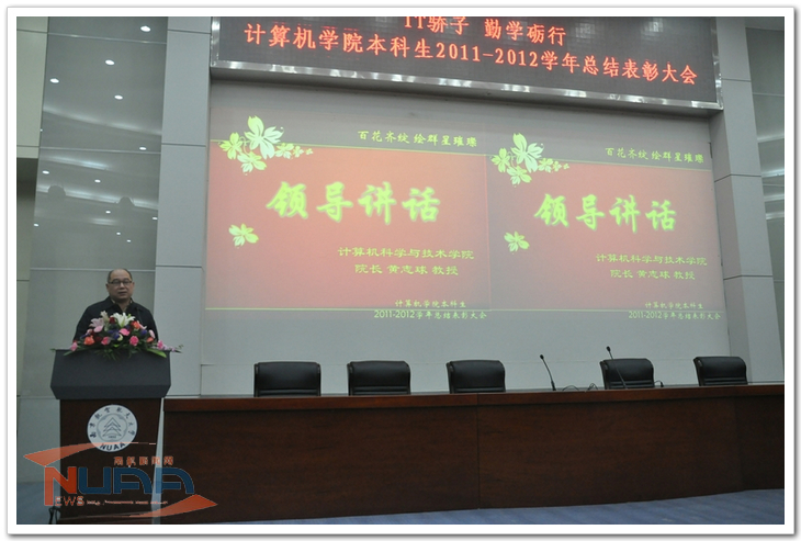 1月4日晚,计算机科学与技术学院2011—2012学年本科生表彰大会在将军路校区主楼报告厅举行。我校82届校友、福建新大陆集团副总裁林学杰,计算机科学与技术学院院长黄志球、副院长陈兵、院党委副书记王国军、青年教师代表李博涵以及学院各年级辅导员、学院获奖学生、各年级学生代表共500余人参会。