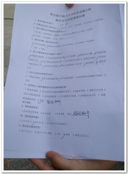 南京航空航天大学车辆工程专业2011级的四名学生王晓旭、翟逸轩等选择与专业相关并与社会实际联系紧密的汽车销售方向作为选题,开展了一次主题明确、深入全面的寒假社会实践活动。 团队从汽车的销售入手,面向4S店销售经理、购车顾客,开展采访和问卷调查。前往位于南京市秦淮区大明路的汽车4S店集散地,对多品牌不同层次的汽车4S店销售经理经行采访,并对正在选购汽车的顾客进行问卷调查。通过与多个品牌的4S店销售顾问交流和进行问卷调查,团队得知如今人们在选购新车时,不管选购的是低档中档高档车,对安全性的重视程度都是不够的(购车因素所占比例排序如下:价格、操控性、外形设计、油耗量、安全性、动力性、售后服务、舒适性和环保、内部设计,而安全性在总共10各因素中仅排第5)。而年龄大的人群普遍比年轻人群更重视车辆的安全性,高收入人群普遍比中低收入人群更重视车辆的安全性,高学历人群普遍比中低学历人群更重视车辆的安全性,家用车人群普遍比商用车人群更重视车辆的安全性。同时还发现,购车者对主动安全配置已经有了较全面的认识和较高的重视程度,对汽车的新安全技术也十分感兴趣。同时团队还得到了4S店方的一些关于行车安全用车安全的建议。