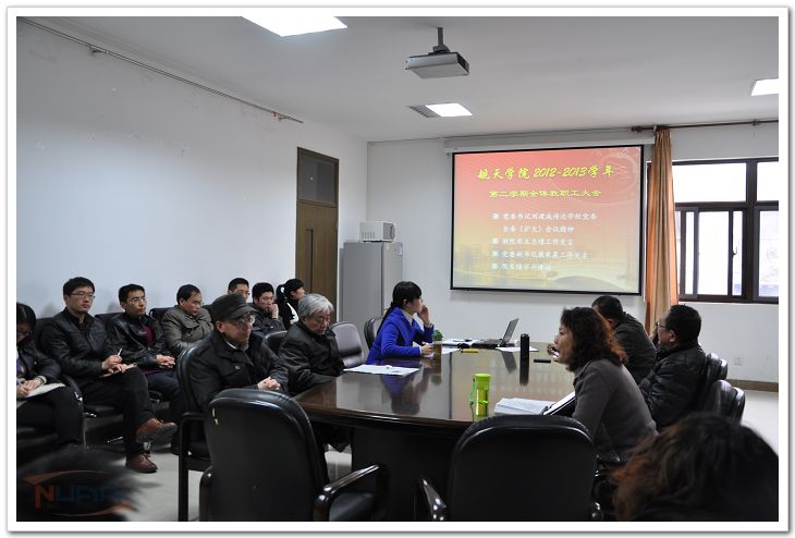 3月1日下午,航天学院在明故宫校区召开全院教职工大会,航天学院全体教职工参会,会议由学院党委书记刘建成主持。会上,刘建成传达了学校第十五届委员会第八次全委(扩大)会议精神,并对2013年学校特色工作中的“积极发展航天特色”做了重点解读,号召广大教师抓住机遇,不断深化自己的科学研究,积极推进航天学科建设。