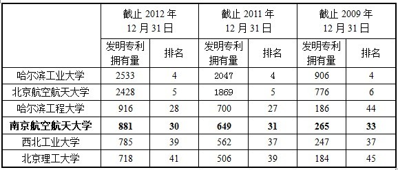 近日,教育部科技发展中心公布了2012年底全国高校有效发明专利(不含国防专利)拥有量前50名名单。其中工信部直属高校有6所,分别是哈尔滨工业大学、北京航空航天大学、哈尔滨工程大学、南京航空航天大学、西北工业大学、北京理工大学。 截止2012年12月底我校有效发明专利拥有量881件,位居全国高校第30名,工信部直属高校第4名。 近年来,我校知识产权工作以“激励创造、积极运用、有效保护、科学管理”为指导方针,通过进一步加强学校创新源头建设,健全知识产权管理制度,完善管理体系和激励考评机制,加强宣传培训等一系列政策措施、条件保障和细致工作,以发明专利拥有量为代表的自主知识产权拥有量进一步增加,在全国高校排名稳步提升,有力的增强了我校的科技核心竞争力,确保科技创新的可持续发展。 以下数据来源于教育部科技发展中心所公布的至2012年底、至2011年底、至2009年底发明专利拥有量及排名数据: ![]() http://www.cutech.edu.cn/cn/zscq/2012/02/1331845499322787.htm http://www.cutech.edu.cn/cn/dxph/cgzl/2010/06/1276129145654081.htm