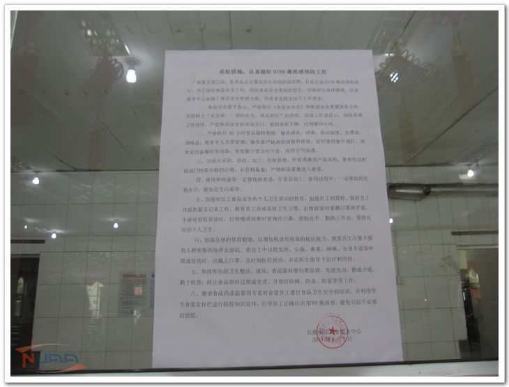 饮食服务中心从报纸、网络中截取相关信息,汇成学习文件,让所有员工了解H7N9禽流感目前的疫情。针对食堂安全工作提出了十一条具体预防措施,如:所有肉禽类产品采购,要有经过职能部门检疫合格的证明,并存档备案;严禁鲜活家禽进入食堂;严格执行48小时食品留样制度和餐具清洗、消毒、保洁制度;免费汤、调味品,要有专人负责管理;餐具要严格清洗消毒和存放;定时使用紫外线灯,对食堂的备餐间等消毒;保持餐厅内的空气流通;在食品加工、食用过程中,一定要做到烧熟煮透,生熟分开,避免交叉污染等;加强员工的晨检,做好员工体温测量及记录工作;出售饭菜时要戴口罩和手套;教育员工尽量不要到人群密集的场所去游玩,若出现发热、头痛、鼻塞、咳嗽、全身不适等呼吸道症状时,及时到医院就诊;保持库房的卫生整洁、通风,食品原料要归类存放,先进先出,勤进少进,防止食品原料过期或变质,并做好防蝇、防虫、防鼠害等工作;邀请食品药品监督局专家对食堂员工进行食品卫生安全的培训,进行防控知识宣传,引导员工正确认识H7N9禽流感。中心还在各食堂窗口处张贴了《采取措施,认真做好H7N9禽流感预防工作》通知,让学生了解饮食服务中心对防控禽流感做了哪些具体的工作,消除顾虑,能放心的在食堂就餐。