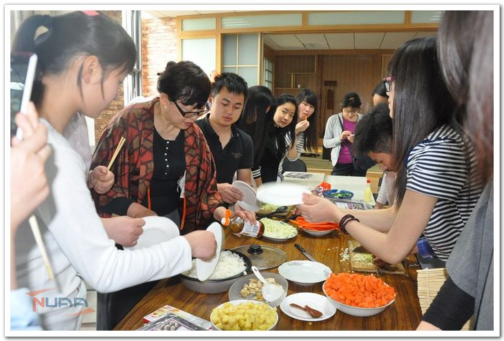 日式风格的榻榻米,半掩着的隔扇,犹抱琵琶半遮面的和服美人……伴着浓浓的日式氛围,日本料理的自然之味弥漫在学院大楼内。在两位外教老师的指导下,同学们亲自体验制作了寿司、日式咖喱、章鱼烧等日本特色美食。