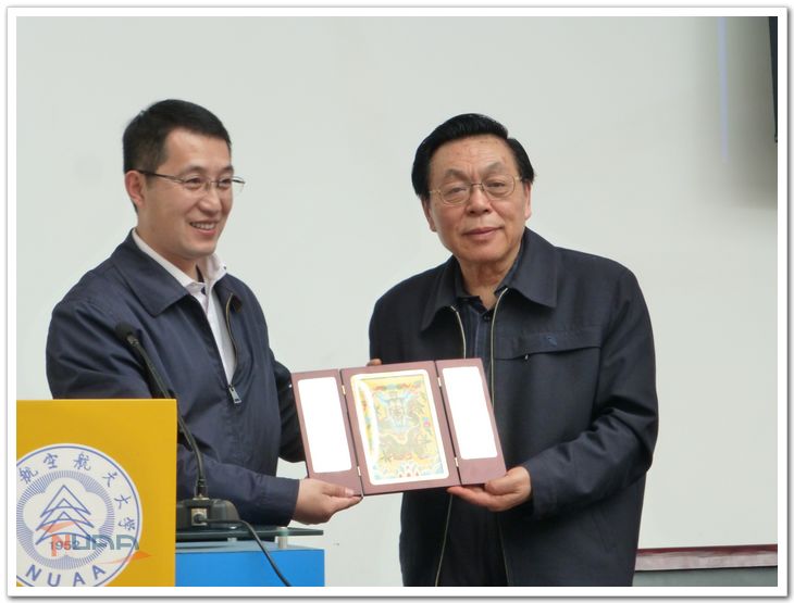 整个报告会历时近三小时,欧阳自远认真、严谨、平易近人的态度深深的打动了在场的每一位师生。报告会后,吴庆文代表学校向欧阳自远赠送“问天”科学讲坛纪念品。